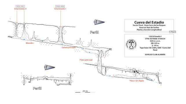Memoria: Esta cueva tiene un interés particular. Una vez que se está dentro y hemos bajado hasta el final, llegamos a un laminador enorme de 80x45 m, que nos da una superficie de 3600 m², una de las salas más grandes de Sorbas.