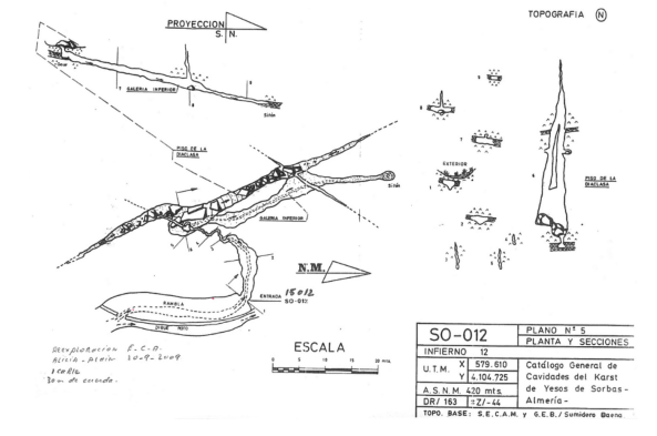 Memoria: Es una diaclasa con un sifón al final de la cavidad, puede que esté relacionada con la 15001 Surgencia de la fortuna, donde el agua entra en el 010 Sistema del yeso para salir al Barranco del infierno.