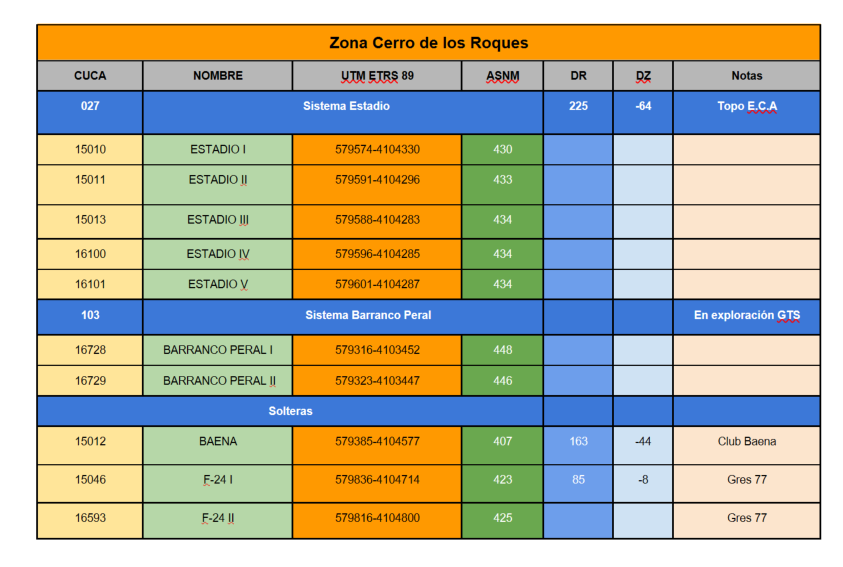 La zona Cerro de los Roques está compuesta por un total de 11 entradas que se dividen en 2 sistemas con 7 entradas, 2 solteras y 2 inexploradas.