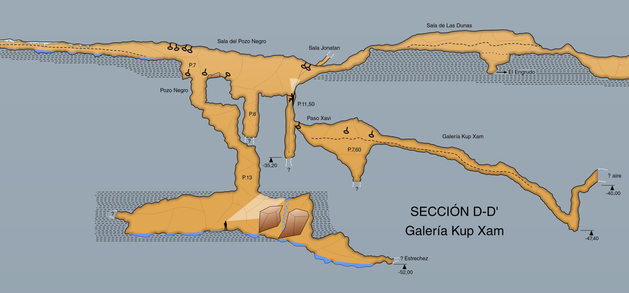 Mientras se continua la exploración Rugi advierte que a mitad del pozo aproximadamente hay una galería horizontal. Rugi pide a Xavi que realice la instalación del pasamanos, al que llamamos “Paso Xavi”. Una vez instalado el pasamanos, de unos 10 metros a lo largo de un meandro desfondado, se llega a dos diferentes vías una justo enfrente, aún pendiente de exploración, y la otra a la izquierda del meandro, se comiénzala exploración y topografía de esta galería a la que se llama “Galería KUP XAM”, nombre que le pone la integrante Ivet y que después dijo el significado de la misma, que era el nombre de su perro invertido Punk y Max.