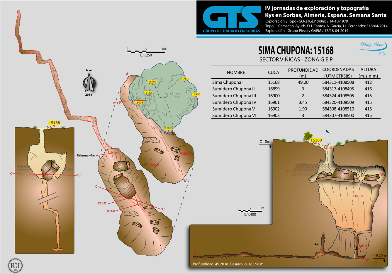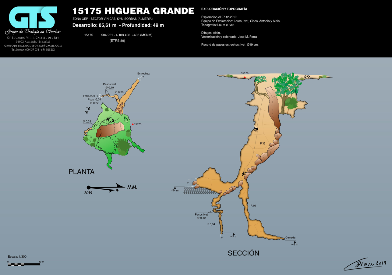 Se topografía el día 18 por Isa Camacho Ávila y Diego Cantos, A. García y Juanlu Fernández. Con un desarrollo de 163 ,96 m y una profundidad de - 49,20 m