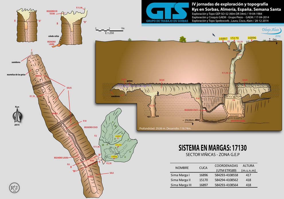 Tenemos tres entradas llamadas marga I, II, III respectivamente. La 15170 con un pozo de 2,50 m; la segunda entrada 16897 con un pozo de 2 metros; la principal 16896 tiene un pozo de 20 m y una sala entera de marga desde la sala de marga nos encontramos un pozo de 8 metros, en su base nos encontramos un meandro “el meandro Cisco” que nos lleva a la base de un pozo de 10 metros. Se asciende por el pozo de 10 metros y nos encontramos otra sala con acceso a otro pozo de 8 metros. La sala en total tiene 56 metros, el fondo se termina con sumideros y hay marmitas del goteo. Es un sistema espectacular por el relleno de marga que es el estrato inicial que todavía no se ha disuelto. En el meandro de Laura tiene una colada de caliza con yeso cristalizado