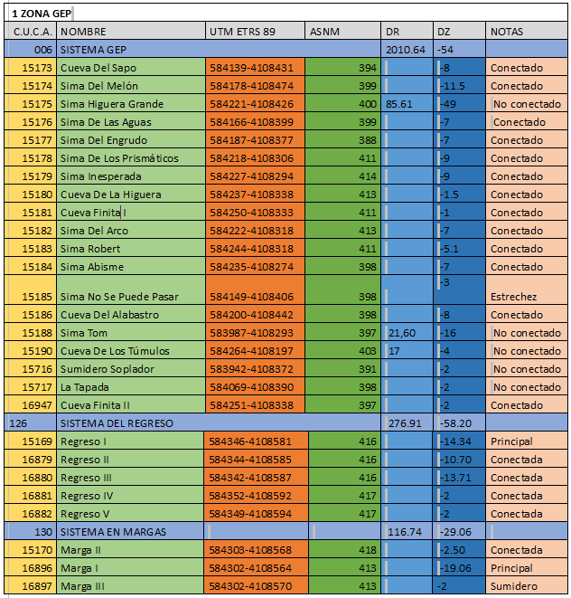 Zona GEP se conocía más en esta zona de ahí su nombre, pero en cambio había muchas entradas olvidadas que no se sabía bien su ubicación. Con el tiempo el GTS fue reexportando y topografiando. Una vez tenido los datos y comparando con los datos antiguos, se pudo localizar todas las cuevas que tenía la zona GEP. Esta zona tiene 41 entradas de la cual tres son sistemas y las demás son entradas solteras.