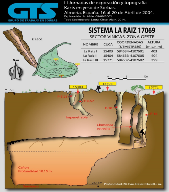Un interesante descubrimiento. Estábamos buscando a dónde va la galería estrecha del sistema 063 el laminador por la superficie, midiendo rumbo y desarrollo que nos conduce a la dolina 15438. Al explorarla parece estrecho y no podemos pasar, seguimos buscando por la superficie y nos encontramos muy cerca en la dolina, una sima de unos 5 metros y 0.35 metros de altura que nos da acceso al interior a través de una gatera. Entramos por la gatera 40 metros de larga y al final encontramos un hueco por el que no veíamos nada de enorme que era. ¡OHH Milagro un gran descubrimiento!, no podemos bajar porque no tenemos material y es un pozo, así que decidimos volver sobre nuestros pasos, contando 1 paso 1 metro, para salir a la superficie y poder seguir el rastro de pasos, a ver si encontrábamos otra forma de acceso, “David conto 35 pasos y yo 45, nos quedamos con 40”, parece que mis patitas son más cortas. Contando 40 sobre la superficie encontramos lo que es la dolina 15437, llamada David TV. Bajamos por un árbol que divide las 2 salas, encontrándonos enormes raíces por el techo y bajando por ellas, accedemos a esa maravilla. También nos encontramos cañones de 16 metros de profundidad, unas formaciones de yeso color rosados y formaciones parecidas a los macarrones entre otras muchos espeleotemas.