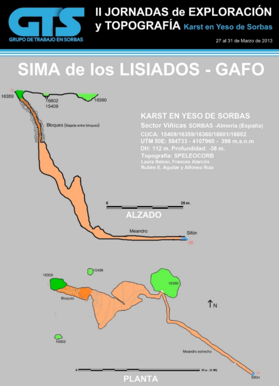 La dolina totalmente cerrada, después de horas de desobstrucción conseguimos abrir la sima 16359. Bajamos la primera sima de 35 m y la segunda de 20 m, al final un meandro estrecho, la sima es muy peligrosa por derrumbe total. Al final de la primera sima, un paso debajo de la “dolina cerrada” que sigue en el pozo 2 con 20 metros, este tiene cristales grandes y muy bonitos.