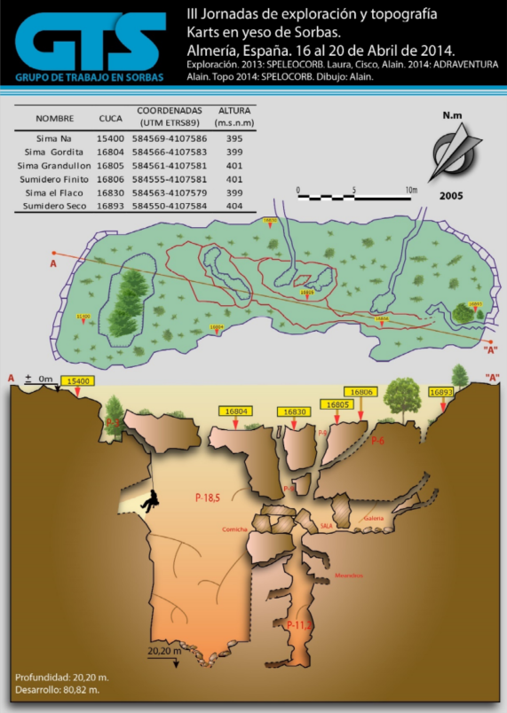 Se vuelve a topografiar en 2014 por Speleocorb, GTS. Dibujo Alain. La rana sigue viva al fondo, le damos de comer de vez en cuando. Hay formaciones, es una sima con una profundidad de 25 m.