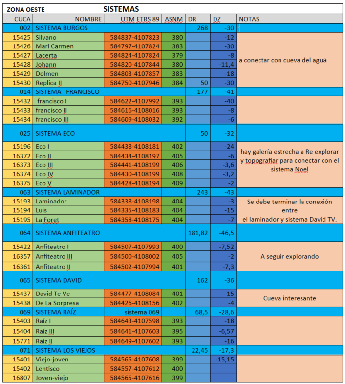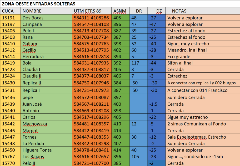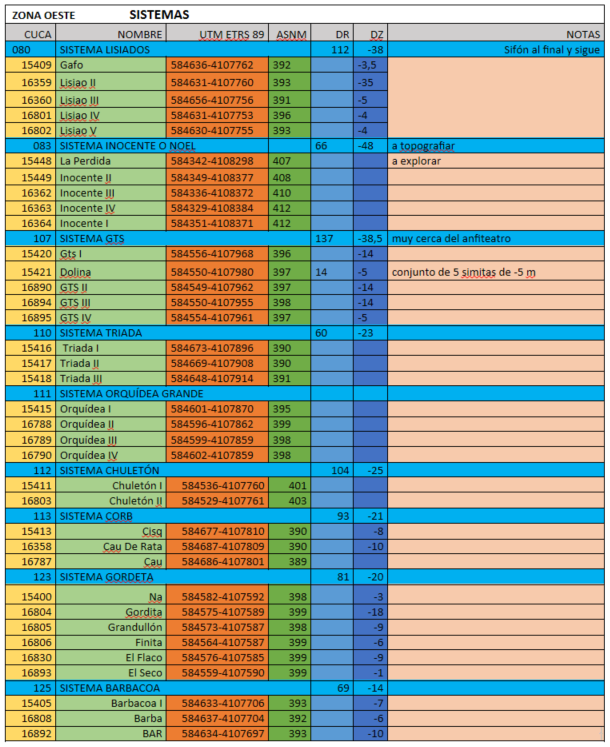Esta zona se ha estado explorando y topografiando especialmente con el club Speleocorb y GTS desde el año 2011. Aquí encontramos 23 entradas solteras y 17 sistemas que comprende 60 entradas. El total de entradas en la zona Oeste es de 83 entradas.